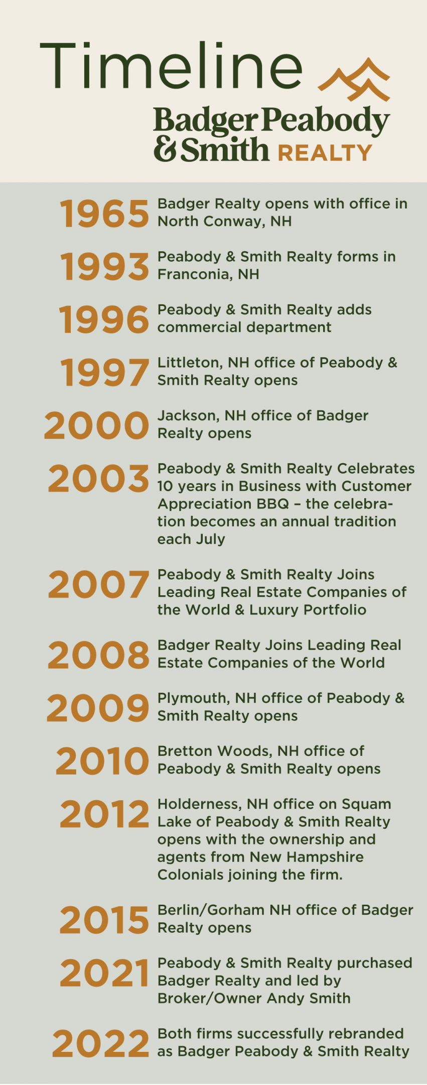 Our name, Badger Peabody & Smith Realty, was announced on February 1, 2022, after two highly respected brands—Badger Realty and Peabody & Smith Realty—completed a merger the previous year. Both firms were market leaders in their respective areas, from the Mt. Washington Valley through Central New Hampshire, the Western White Mountains, and the North Country.